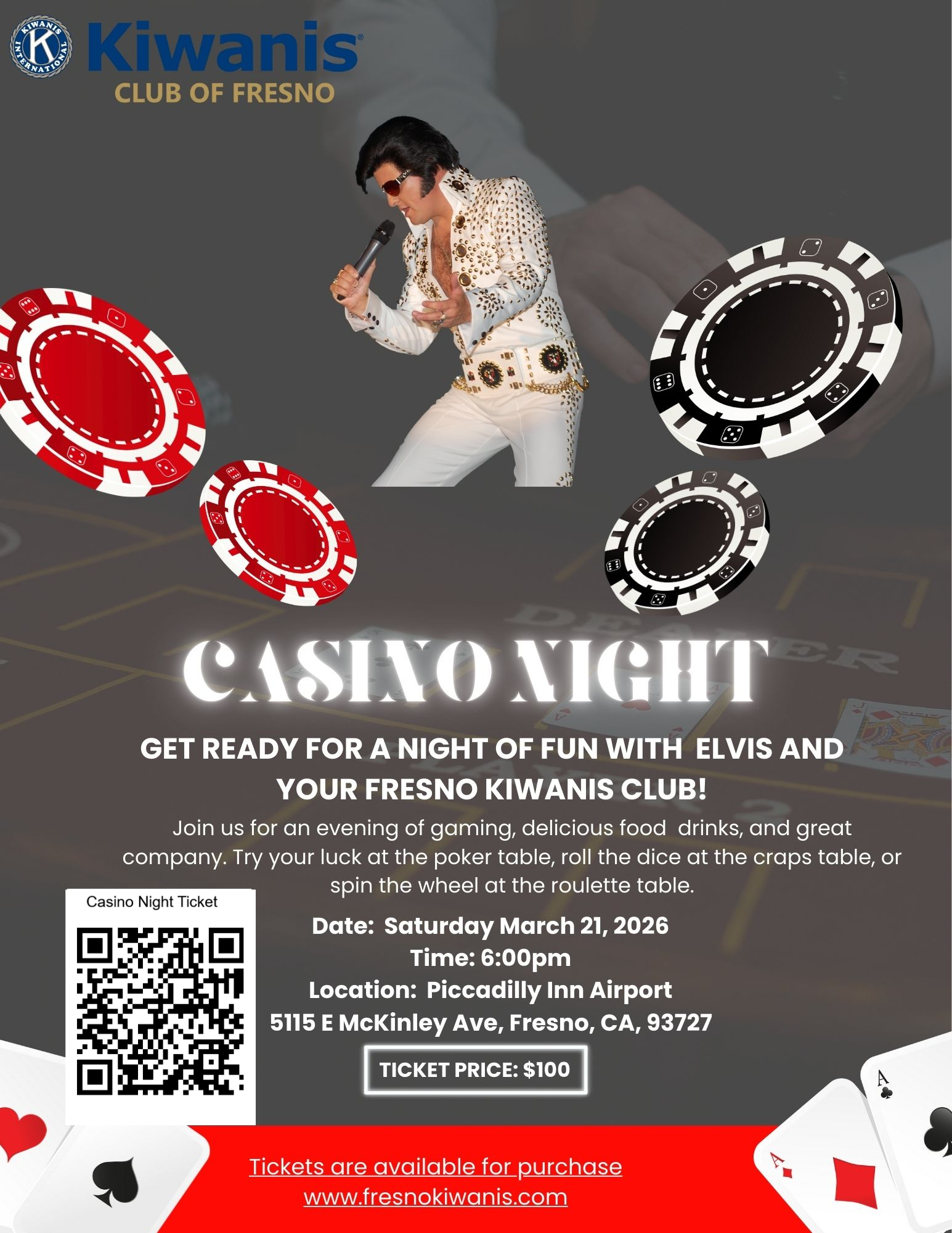 6:00 pm Fresno Kiwanis Casino Night Piccadilly Inn Airport 5115 E McKinley - Fresno *Tickets $100 per person for dinner, gaming, and more...JEP show at 7:30 pm...click here for tickets |